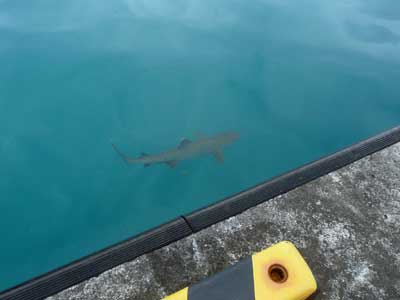 ここはとびうお桟橋といって、漁船やクルーザーが停泊している町なかのただの港。そこでさえこんなに澄み渡っていて、眺めているとアオリイカの子だのオヤビッチャだのがよく見える。今年は、ごらんのとおりホワイトチップ(サメの一種)までゆらゆらいたので、びっくりした。陸からサメの写真撮れる桟橋なんて、まず日本では珍しいでしょ。