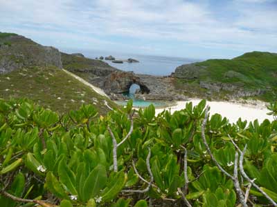 珍しい固有種が一番残っているというここ南島も、上陸規制が一段と厳しくなった。自然遺産になったら、たぶん、上陸禁止になっちゃうんじゃないかな。手前に生えているのはクサトベラという美しい灌木。