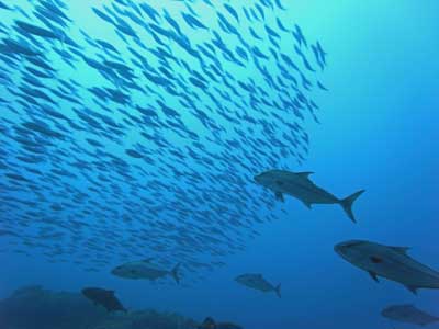 今年はでっかいカンパチの群を間近に見ることができて、感動した。ダイバーをものともせず、すぐ目の前を回遊する。カンパチの後ろに写っているのはクマザサハナムロの大群。