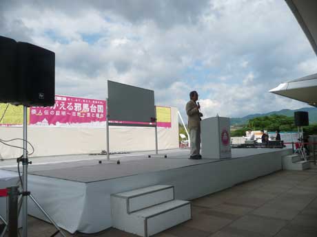 屋外の会場がとてもさわやかでいいのよね、ここのシンポ。客席も満杯でした。壇上は学芸員の折尾学さん。進行はミスター吉野ヶ里こと高島忠平さんが担当。