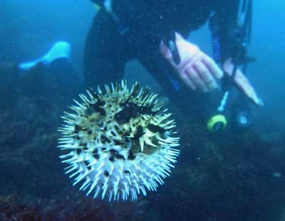 ごぞんじハリセンボン。人間に囲まれてパニクってふくらんだ。右中央が顔なんだけど、針に埋まってわからないね。