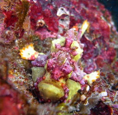じゃ〜ん! 正面です。両手(ヒレ)で岩に踏ん張ってます。顔が歌舞伎のクマドリみたいでしょ。だからその名もクマドリカエルアンコウ。