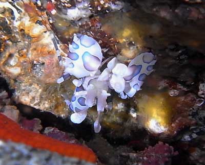 そのひとつ。富戸でずいぶん育って大きくなった。といっても2〜3cmかなあ。フリソデエビってエビ。この状態、穴の天井に逆さに貼りついてます。こっち向いてます。名のとおりハサミが振り袖みたいにふくらんでる。期せずしてお正月むけ。ヒトデが好物なの。この時もアカヒトデのそばにいた。左下の赤いのがそれ。