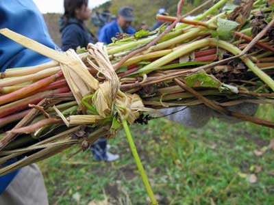日常世話してくれているひとたちが刈り方や束ね方を指導。写真は、お手本。2本ほど藁を取り、蕎麦束に二回巻き付けて、一回ねじって、ぐじゅぐじゅぐじゅともんでしなやかにして、巻き付けた部分に挟み込む。先生のを見ていると実に手早く上手にできるのだが、やってみると・・・なんでも修練ですなあ。