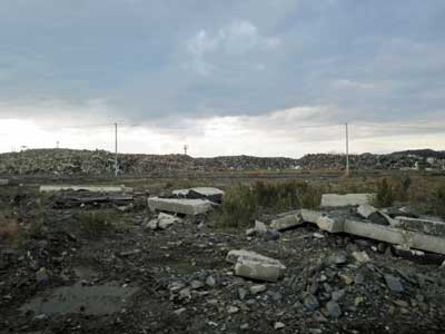 被害が大きかった村落では、崩壊した建物はもうほぼすべて片づいて荒涼たる住居跡が広がり、その脇に仮設住宅が立ち並んでいた。そして、帰路、松島駅へ向かう車でとおりかかったある地域では、なにもなくなった建物跡の広野に、取り片づけた瓦礫の山が、まるで奈良大和の山々のように横たわっていた。
