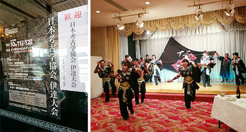 伊達紋別の駅から会場までの道中、昼食のために入ったレストランやホテルの入口に、「歓迎 日本考古学協会伊達大会」という張り紙と立派な大会のポスターが貼られていて、地元をあげて迎えてくれているようで、嬉しくなりました。会場の一角では、和服姿の女性達がお抹茶のサービスをしてくれたり、懇親会も地元の若者達がヨサコイ・ソーラン節で賑やかに盛り上げてくれました。いつものソッケない学会とは違い、市民ならではのおもてなしで、とても楽しく和やかな雰囲気。伊達市の好感度がググッとアップした2日間でした。
