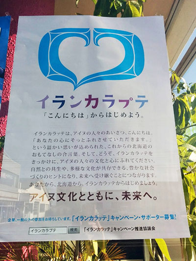アイヌの人達のことは千夏さんが詳しいので、いまさら何をって言われるかもしれませんが、今回初めて知ったこと、「イランカラプテ」アイヌ語で「こんにちは」。「イランカラプテ」を広めようというポスターをみて、はっとしました。ニイハオもアンニョンハセヨもグーテンタークもボンジュールも知っているのに、「イランカラプテ」は知らなかった。広めましょう。広めなきゃ・・・と思ったサコでした。