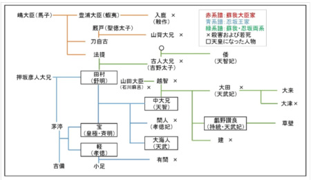 チナ で? 古人大兄皇子というのは34代舒明と蘇我入鹿の妹との間にできた子で、だから、天智・天武兄弟から見ると、ええっと、母違いの兄に当たるわけか。