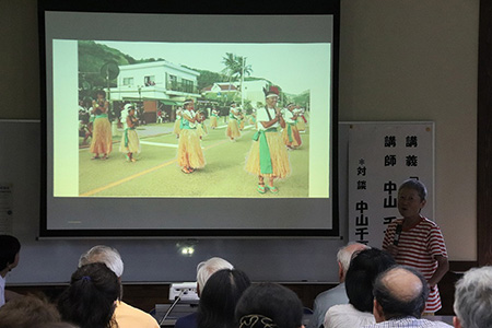 そして、千夏さんの「ボニン島の人々」のお話が始まりました。島で仲良くなった人達の話、小笠原返還50周年記念パレードの話、島の伝統芸能、日々の生活など、千夏さんの体験談、そして千夏流ボニン島歴史解説まで、知らないことだらけのお話に、受講生は居眠りもせず、「へ〜!」「ほ〜!」と目をまんまるにして聞いていました。