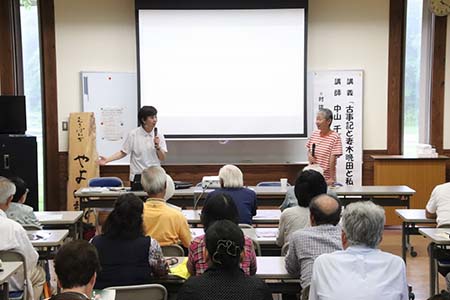 外は大雨。川が増水して避難勧告が出たりしており、朝から欠席の連絡があいつぎました。それでも70名ほどが来てくれました。いよいよ、やよい塾の始まりです。冒頭で私が、妻木晩田遺跡の保存運動を始める時から現在にいたるまで、たびたび千夏さんに来ていただいて、背中を押してもらってきたことを紹介しました。そして、今日は急遽テーマを変更して、ボニン島の話をしていただくことも。