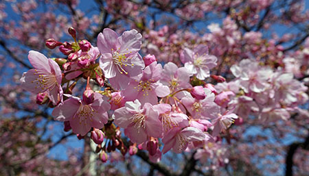 ちょうど私が伊豆に居を構えたころ、だから、1974年ごろに伊豆半島の河津で「発見」された。ふつうより濃いピンクのこの桜を採取して庭に植えていたひとがいた。今、その庭の原木は、ちゃんと河津の観光コースに入ってます。