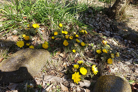 もうひとつ、私の自慢は、庭に「放し飼い」のフクジュソウ。何十年か前、お正月の飾りに小さな盆栽を駅前で買いました。よくあるやつ。フクジュソウ一株と赤い実のヤブコウジなんかを寄せ植えにしてあるやつ。捨てるつもりで庭の片隅に埋めたのが、何年かたったら、わっ、咲いてる!