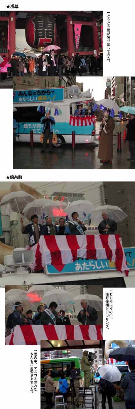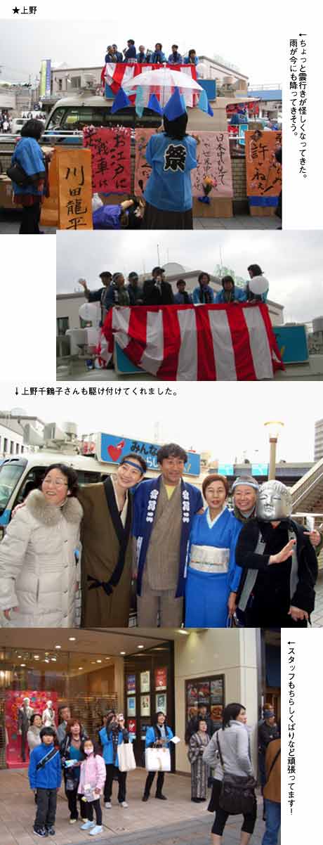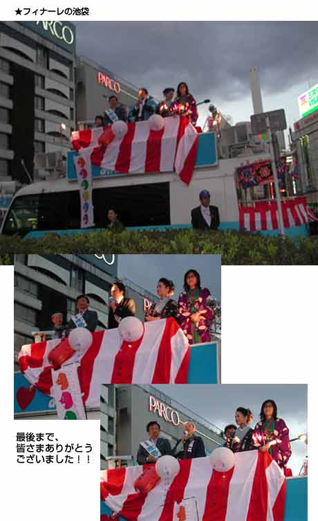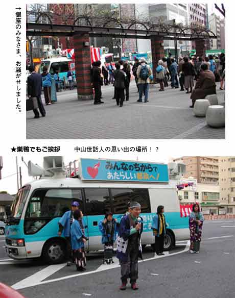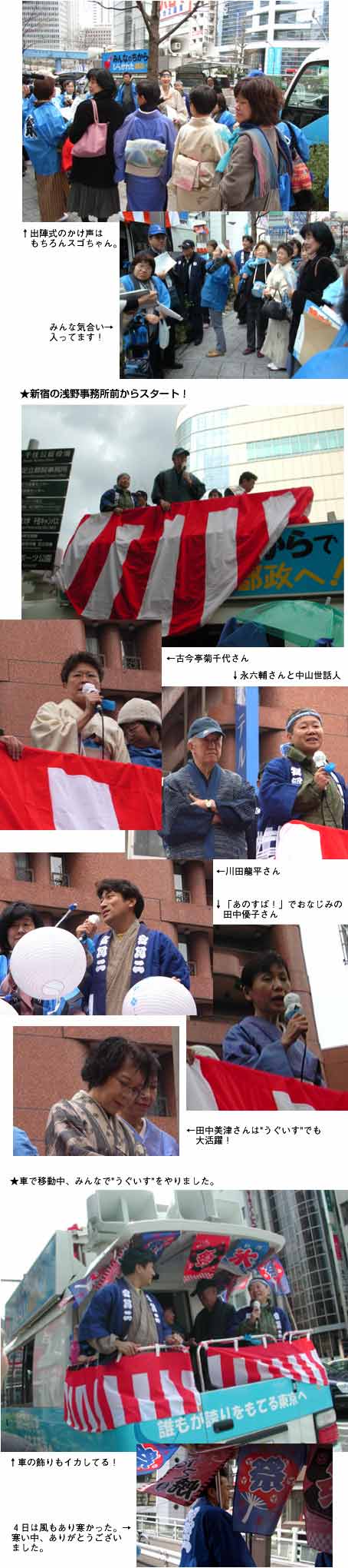 大江戸勝手連を立ち上げ、永六輔さんを副知事にと、2日間街頭宣伝をしました。 もちろん。江戸情緒豊かに着物姿で、お祭り騒ぎ。小道具はみんなで作って、はいできがり。打ち上げは、他の勝手連の人も合流して、ワイワイがやがや。都民の心意気に感じてくれて出馬してくれた浅野さんに「ありがとう」を言おうよとみんなで、大合唱!