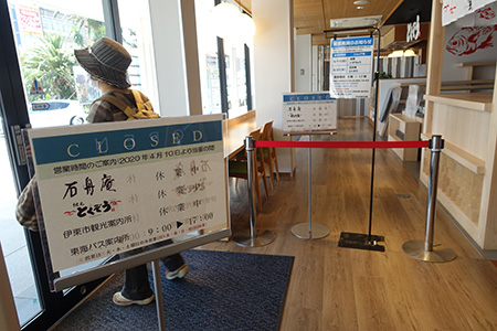〈CLOSED 営業時間のご案内(2020年4月10日より当面の間)〉〈石舟庵 休業中〉〈とくぞう 休業中〉〈伊東市観光案内所 休業中〉。新型コロナウイルスのせい、国家的、いや世界的緊急事態のせいなのだ。