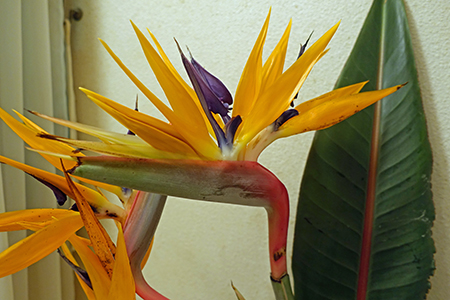 しかし驚いた。花器に挿して近くで見ると、その迫力、なまなかではない。どこに置いても周囲が顔負けしている。緑にピンクのボカシが入った太いクチバシに、オレンジや紫の冠毛あでやかな、まさに南国の鳥の姿。今にもギャオギャオと声をあげて羽ばたきそうだ。葉も、まるで木彫の大きな羽根みたい。