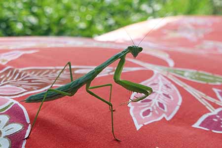 干した布団にカマキリ君が。ベランダで、8月12日。