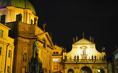 白亜の壁がほんわりとライティングされた街路、中世の香りを色濃く漂わせる幻のような街並み。ロマネスク、ゴシック、ルネサンス、バロック、ロココ、あらゆる古典の建築様式が入り混じる。まぎれもなく夢の世界。石畳を歩きながら芝居のセットにいるような気分になる。曲がり角から現れるのは、裾をひきずりながら俯いて歩く黒いヴェールの女、であっても不思議ではない。というより、そうあってほしい。そっちが正解! 残念ながら実際にはヘッドフォンを付けてシャカシャカ音を漏らしつつ、からだを揺らせ歩くジーンズのティーンエイジャーの群れだったりする。これが観光都市の愉快なところでもあるとうなずきつつ、ひるまず私は空想をめぐらす。プラハは、気を削ぐリアリティをはね飛ばして、空想も妄想もしっかりと受けとめてくれるだけの貫禄のあるおとぎの国だ。ぺらぺらのレジャーランドなんかと比べるなよ。だからして、この究極の物語環境に溺れなくてどーするんだね!