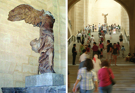 ニケ像はいつでも人気者だ。片足を踏み出した立ち姿の凛々しさと、翼の、優雅にして伸びやかであること。大きな像だから、見ているだけで気分が高揚する。深い呼吸ができる。そして多分、ここまで人を惹き付けるのはニケに顔がないからだ。ときどき想像してみるけれど、あそこにアルカイックスマイルの顔なんか付いていたら、興ざめ以外の何ものでもない。欠けているというのは、ときに大切なことである。ミロの片手は10本でも20本でも出土されたっていいから、ニケの頭は未来永劫出て来てほしくないと願っている。